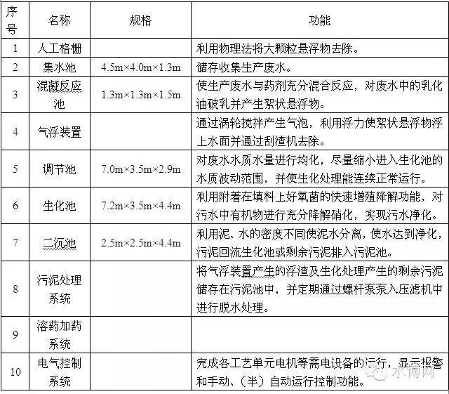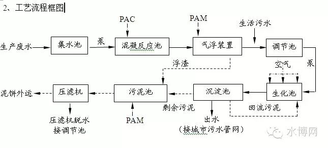 本工艺采用物化和生化相结合的方式。废水首先通过格栅去除废水中的大粒径颗粒物,以保证后续工段的安全、稳定运行。在生产废水中含有大量的乳化油,故先加入适量的PAC(聚合氯化铝)对其进行破乳,产生细小矾花,再加入PAM充分混合产生更大的矾花,再气浮池内利用涡轮搅拌产生的大量细小气泡的吸附、顶托、裹夹作用使矾花浮上水面,与污水分离。水面上的浮渣通过刮渣机刮渣进入污泥池中,预处理后的生产废水排入厂区污水管网中,然后与管网中的生活污水一同进入调节池中,停留足够长时间使污水的水质得到均化,同时在24小时内调节污水的水量,保证后续生化处理的连续稳定的运行。调节池中的废水通过提升泵提升进入生化池。在生化池中,通过生长在填料上的微生物自身的新陈代谢对污水中的污染物质进行吸收分解利用,从而使污水得到进化,老化的生物膜在水流冲刷作用下脱落并随水流进入沉淀池,在沉淀池中,利用泥、水重力的不同使泥水分离开,上清液排放进入城市污水管网中,下层污泥通过空气提升所用部分回流到生化池中,剩余部分排入污泥池中。污泥池中的污泥在加药调理改善其脱水性能后通过螺杆泵泵入压滤机中,通过压滤机的作用降低污泥的含水率,使污泥能够便于外运处置。在生化池中不断通入空气曝气,以保证污水中溶解氧的浓度,使微生物能够正常的生长。